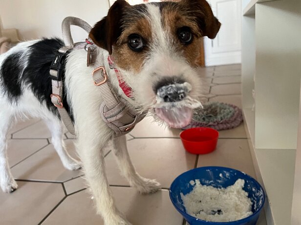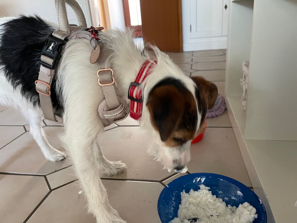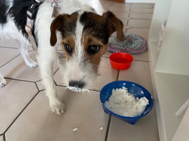 Von der Tierärztin verordnete Schonkost: Reis und Quark. Dann esse ich wenigstens mit vollem Einsatz