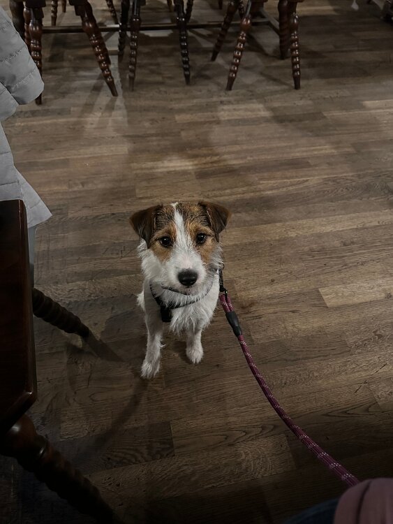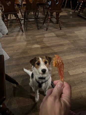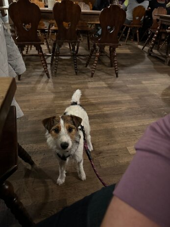 Bräustüberl des Hofbräuhaus Berchtesgaden. Die 4 Phasen bei Mila: treu gucken, Sitz, Futter in den Hund. Danach lieb unter dem Tisch liegen. Mit ihr kann man weggehen